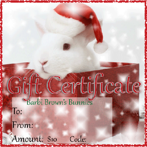 Gift certificates make great gifts. They may be redeemed on line or at Barbi Brown's Bunnies barn or at a show.To redeem use the code number that is listed on the Gift Certificate at checkout.